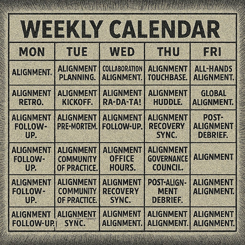 Daily standups that drag for 45 minutes. Weekly "sync" calls where nothing gets decided. Quarterly planning sessions that produce beautiful roadmaps nobody follows. You've scheduled alignment into oblivion. Now your calendar is full, your roadmaps are beautiful, and your teams are still moving in opposite directions.